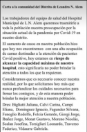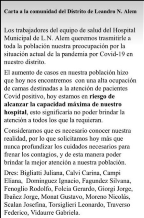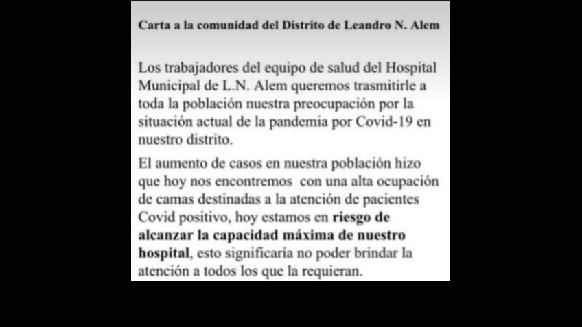 En una carta dirigida a la comunidad del distrito, los trabajadores de la salud pública expresaron su gran preocupación por la situación que está atravesando el partido con respecto a la pandemia de COVID-19.