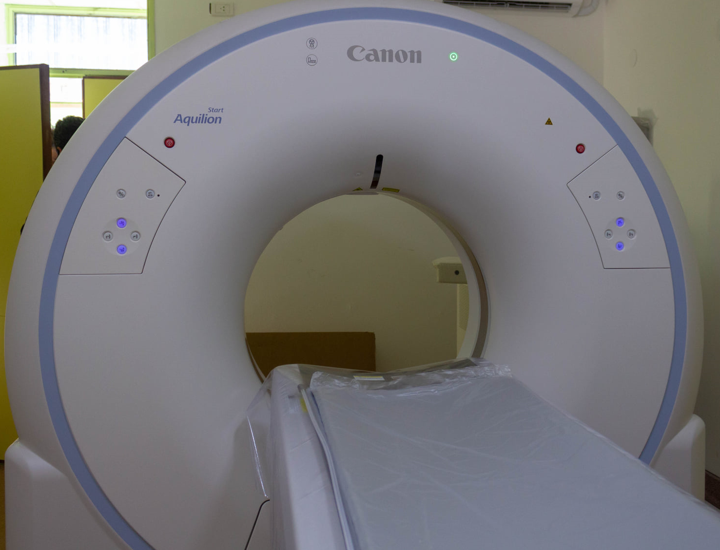 El especialista en aplicaciones clínicas, José Guillén, brindó entrenamiento a los radiólogos que van a estar a cargo en el manejo del equipo del tomógrafo. Consultado por los trabajadores de prensa, el capacitador dijo que “el tomógrafo fue fabricado en Japón, este modelo es el más nuevo y uno de los primeros en llegar al país. Es un tomógrafo de seis pilas de detectores, es un equipo de diagnóstico por imagen, cuenta con una tecnología de última generación a nivel mundial”, además destacó que “las ventajas de contar con este tipo de características y prestaciones en el equipo es que podamos realizar una gran variedad de estudios con una alta calidad de imagen, estudios rápidos, alta resolución y lo principal es que, gracias a la tecnología que tiene el equipo, es que todos estos estudios podemos realizarlos con baja dosis de radiación siendo muy importante para cuidar al paciente”.