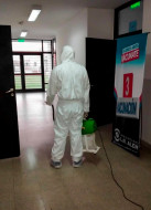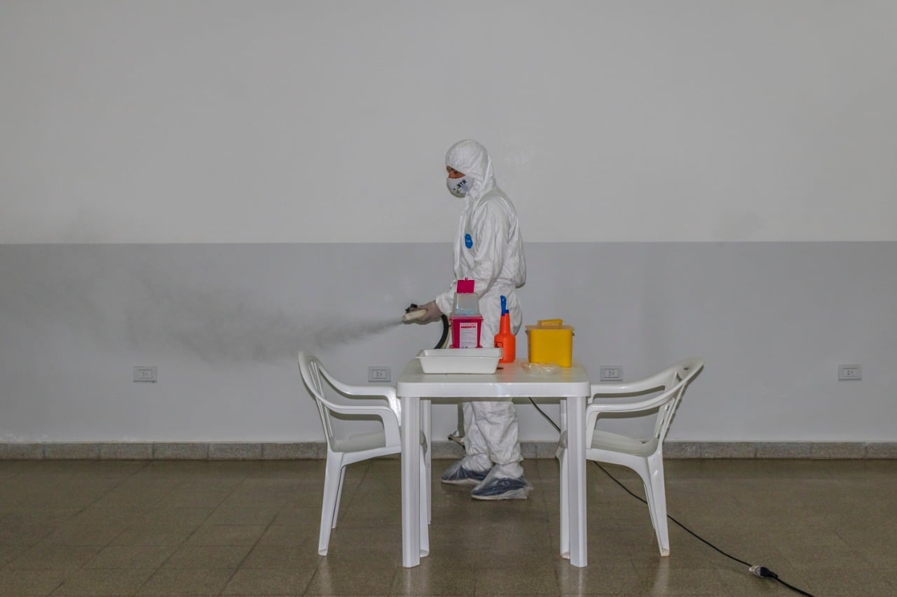 “La herramienta que se utiliza es un termonebulizador, el cual produce una ‘niebla’, que mezclado con un producto avalado por el SENASA (El Servicio Nacional de Sanidad y Calidad Agroalimentaria) se pasa por toda la superficie en contacto; se deja actuar durante dos horas, con el espacio cerrado y luego el virus queda neutralizado”, explicó Carlos Ceballos, de la empresa MYM, a cargo de Mariela Arguello.